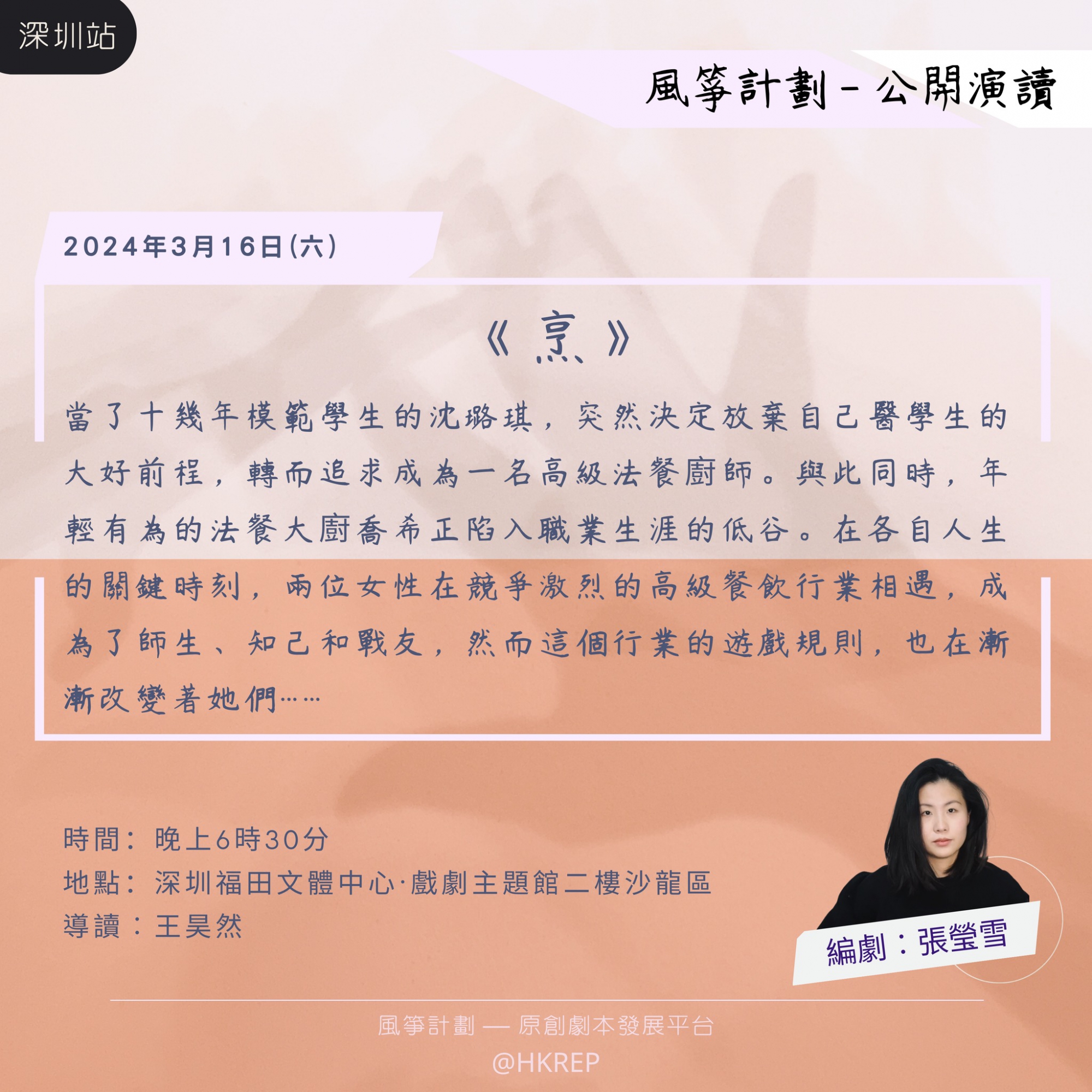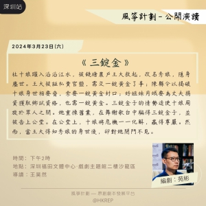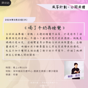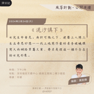 透過「風箏計劃」話劇團去年從各地徵集華文劇本投稿,並挑選出14份作品,依據作品創作的語言和語境,將安排於2024年上旬分別在香港和深圳作第一輪的公開演讀。最後被挑選進入第二輪的5個劇本,將參與為期半年的精煉工作坊,由藝術總監潘惠森親自落場交流分享!