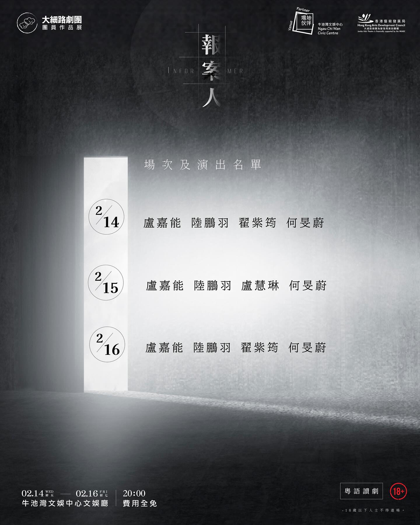 本年度大細路團員作品展將以讀劇形式演繹《報案人》,承蒙編劇龐士榤先生授權演出該獲獎劇目。大細路劇團的團員作品展是專為製作非兒童劇目類型而設。目的是讓長期合作的劇團伙伴展現他們在藝術上的不同面向,同時為觀眾 - 特别是恆常欣賞大細路劇團的家長們 - 帶來新鮮的劇場體驗。期待你的參與,劇場見。歡迎觀眾報名觀賞,費用全免,先到先得。