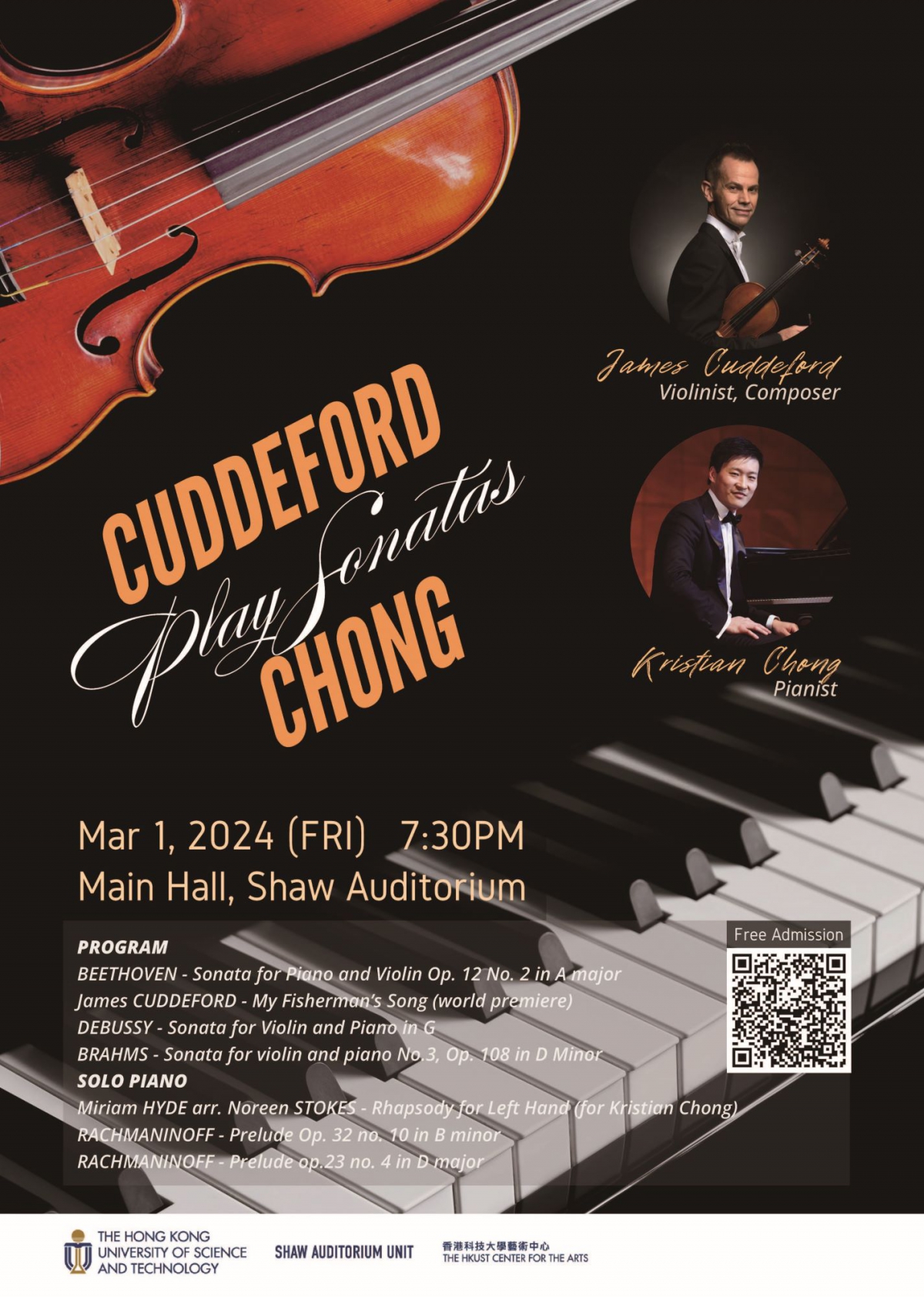 Concertmaster of the Hong Kong Sinfonietta James Cuddeford joins celebrated Australian pianist Kristian Chong in Sonatas of Beethoven, Debussy and Brahms. These works are played alongside a world premiere for violin and piano from Cuddeford, an acclaimed composer as well as violinist - 'Fisherman's Song', and some Rachmaninoff Preludes for piano. Chong is one of Australia's leading pianists; he has performed with most of the major Australian orchestras and with many renowned musicians in chamber music including cellist Li-Wei Qin and flautist Megan Sterling, with whom he appeared at HKUST Music Alive! back in 2018.