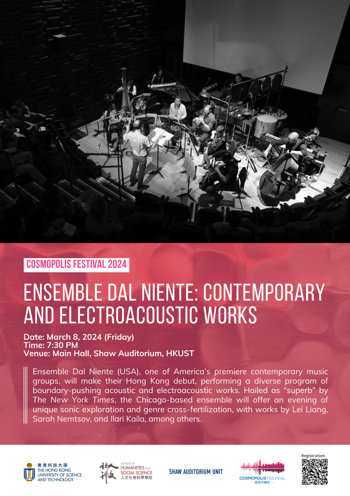 Ensemble Dal Niente (USA), one of America's premiere contemporary music groups, will make their Hong Kong debut, performing a diverse program of boundary-pushing acoustic and electroacoustic works. Hailed as "superb" by The New York Times, the Chicago-based ensemble will offer an evening of unique sonic exploration and genre cross-fertilization, with works by Lei Liang, Sarah Nemtsov, and Ilari Kaila, among others.