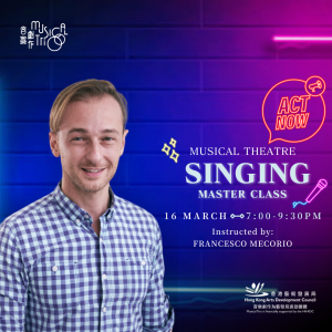 想要提升你的歌唱技巧、更深入地理解如何運用聲音演繹音樂劇歌曲,並且獲得一對一指導嗎?第四回歌唱技巧大師班我們邀請到 Francesco Mecorio 指導,帶領大家進行聲樂熱身、並會挑選學員進行即場歌唱指導,提高歌唱技巧,現場更有琴師即場伴奏,名額有限,請從速報名!【旁聽觀摩】你可以近距離觀察大師指導其他參與者的過程,從中學習。同時,你還可以參與聲樂熱身和問答環節,從中獲得豐富的知識和技巧。適合所有音樂劇愛好者。