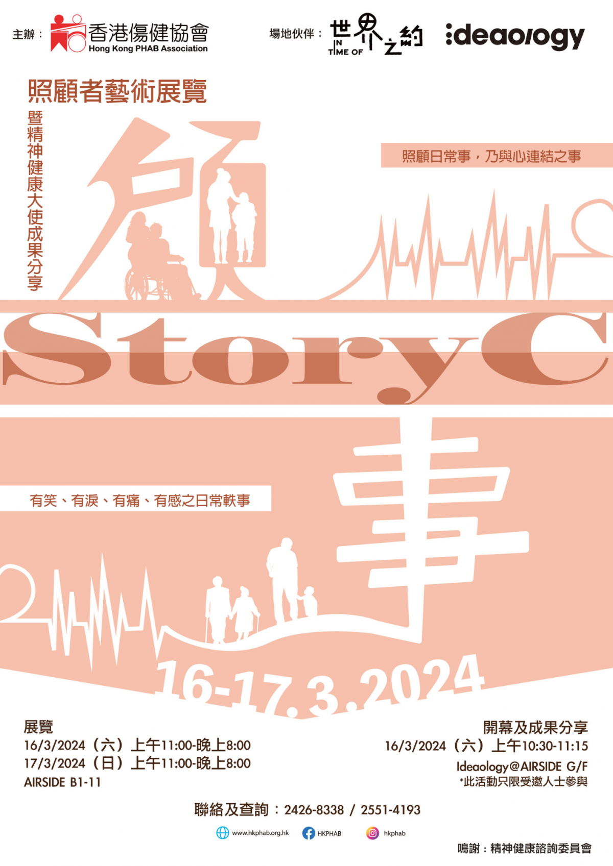 香港傷健協會將於3月16及17日在啟德AIRSIDE舉辦《顧・ 事Story C》照顧者藝術展覽,讓照顧者透過藝術創作表達他們的故事和照顧歷程中的情緒,藉此讓社區人士關注照顧者之精神健康。展覽以視覺藝術創作,配合互動元素及感官元素,展出和諧粉彩、平面繪畫、手工及立體創作等超過30件藝術品,並由精神健康大使及導賞義工,為參觀者細說作品背後的「顧」事。展覽劃分為五個小展區,配合五種感官探索,包括聲音、影像、畫作、氣味、物件等,與參觀者互動,一步一步走進入照顧者之《顧.事》世界。展覽免費入場,歡迎公眾參與。