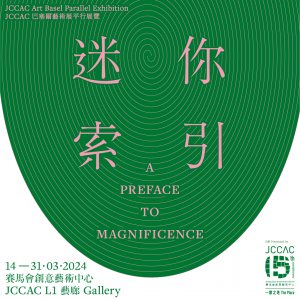 延續JCCAC十五週年關於思考「自我存在」的議題,藝術家將挑戰在有限的空間、物料、時間限度之中創作迷你作品,以呼喚他們對生命的熱忱,濃縮了最具力量且赤裸的自我展現。迷你作品亦作為人之索引,引導觀眾如何閱讀及理解同場展示之代表作品。