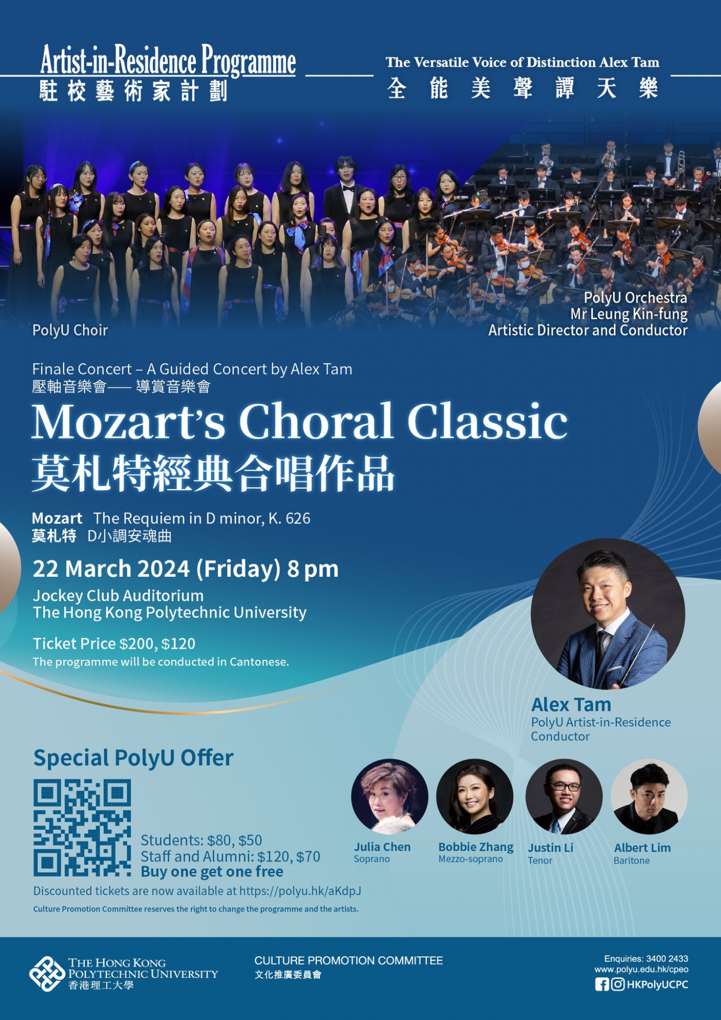 莫札特《安魂曲》是莫札特最後一部作品,它充滿激情和感人的旋律,是古典音樂史上一部經典的合唱作品。這部作品以其深情的旋律和感人的和聲,觸動人心,讓人深深地感受到音樂的力量和情感的共鳴。譚天樂先生將帶領理大合唱團聯同理大管弦樂團表演莫札特此一經典作品。