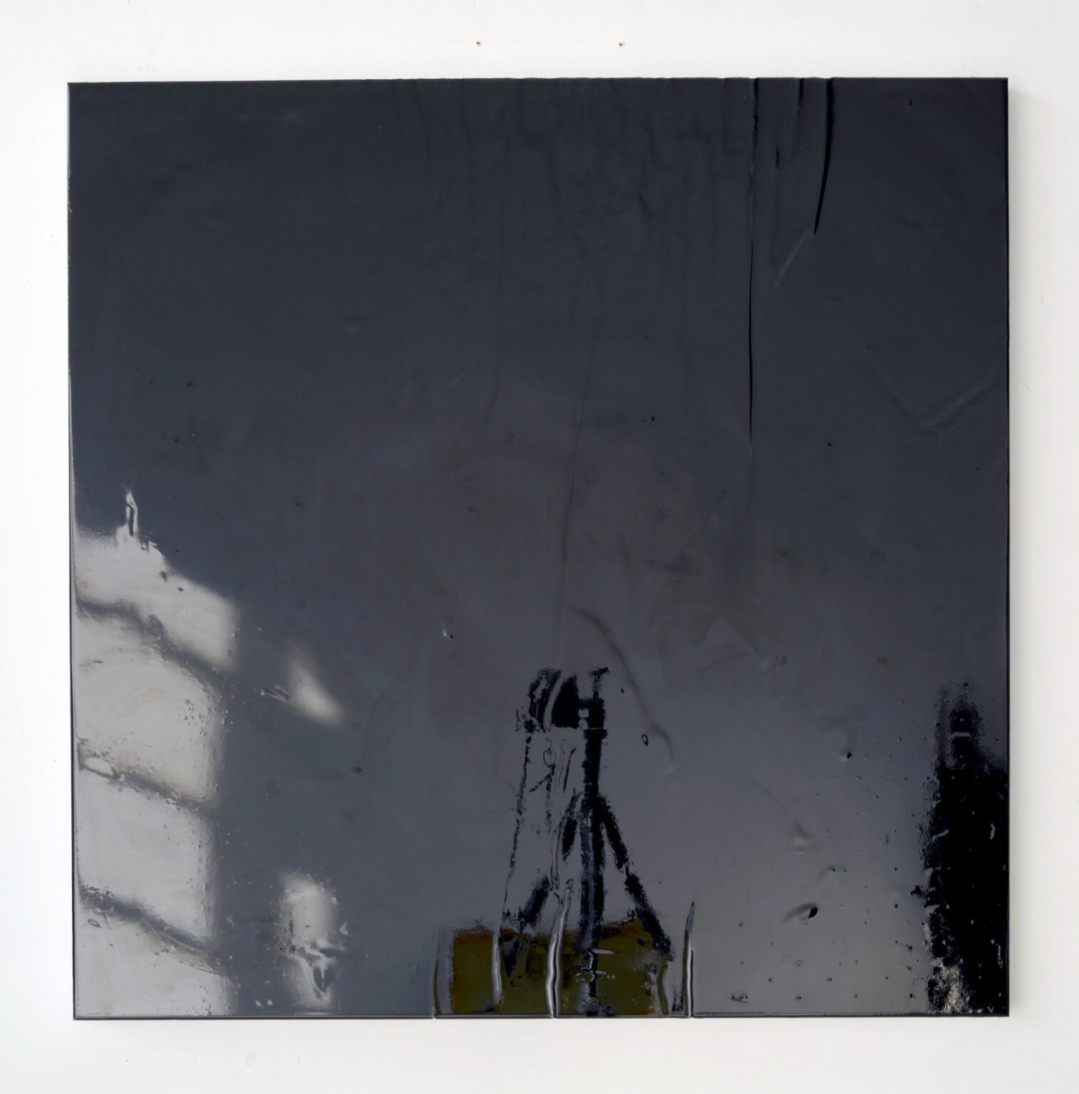 在創作《20乘16 (黑色乙烯基摺)》(2015/2024)時,山岡嘉里曾將乙烯基薄膜折疊;這不僅在畫面左側留下了一道自上而下的印記,也因藝術家在黑色材料上的指紋而形成了不可見的抗觸肌理。這最終導致了出人意料的變化:藝術家隨後傾倒在薄膜上的透明樹脂緩慢地從留下指紋處剝離。作品持續不斷地產生微妙的變化,重構原應在近十年前的「拍攝」時刻定格的「圖像」。山岡嘉里在近期為該作品重新添加了另一層樹脂表層——她在近年的藝術實踐中常回顧早期作品,主動為其添加新的維度。