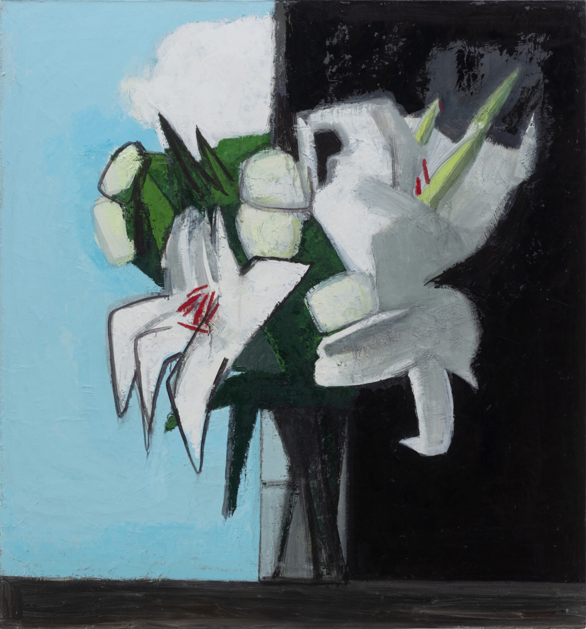兩幅以《百合》(2022)為題的近作延續了藝術家孤立檢視瓶中花卉的作法,而《閱讀與百合》(2021-2023)則以更複雜的構圖精細地整合了劉曉輝多年來深入探索的元素:深邃、沈靜的色彩;彼此疊加勾聯的矩形結構;曲徑通幽式的畫面深度;不以正面示人的女性形象,以及靈動安詳的貓。《白色木槿》(2023)、《黑背景前的白色木槿》(2023)及《無題 — 在紅色木槿前》(2021-2023)等大尺幅作品的關係也是如此:歸屬於自然領域的花卉在有生活氣息的環境中變成了尺寸碩大的「畫中畫」,如夢境幻影一般映照生活的真實感。精緻的小尺幅油畫《閱讀和白色木槿》(2023)則更為朦朧混沌,打消了人物與背景的涇渭分明關係,讓人想起戈雅銅版畫作品中的迷離景象。