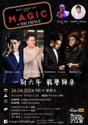 一班香港魔術師,將會齊集於中環藝穗會奶庫 The Dairy,獻上他們最熱愛和擅長的舞台和近景魔術!透過出神入化的技巧、秘密和心理學,加上強勁的顏值和魅力,全力轟擊每一位現場觀眾的五感及心靈深處,並為大家帶來無限的可能性!最天馬行空的魔術即將發生於眼前,並在你的腦海中綻放!預售票將於表演當日 26/4 中午 12:00 停止售票。