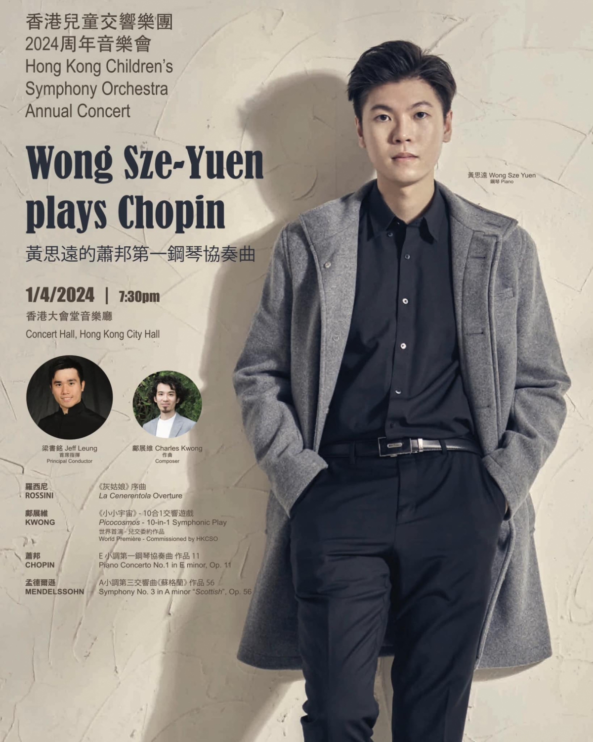 亞洲蕭邦國際鋼琴比賽 ( 專業組 ) 一等獎得主,香港鋼琴家黃思遠,將與香港兒童交響樂團演奏蕭邦第一鋼琴協奏曲,此曲既光輝燦爛而且浪漫又優雅,完全反映蕭邦成熟時期的風貌。德奧作曲家孟德爾遜被喻為音樂風景畫高手,首席指揮梁書銘將帶領樂團演奏的第三交響曲「蘇格蘭」色彩陰沉幽暗、氣韻生動,充滿異國情調,將蘇格蘭風光與文化的鮮活畫面呈現於音樂舞台上。家喻戶曉的童話故事《灰姑娘》在作曲家羅西尼筆下,成為一套具嘲諷和調侃意味的意大利喜歌劇,觀眾透過其序曲可以感受到意國生動有趣的世態人情。同場,樂團亦會首演委約香港作曲家鄺展維所創作的《小小宇宙》-10合1交響遊戲,讓音樂會增添21世紀國際都會的豐富色彩。