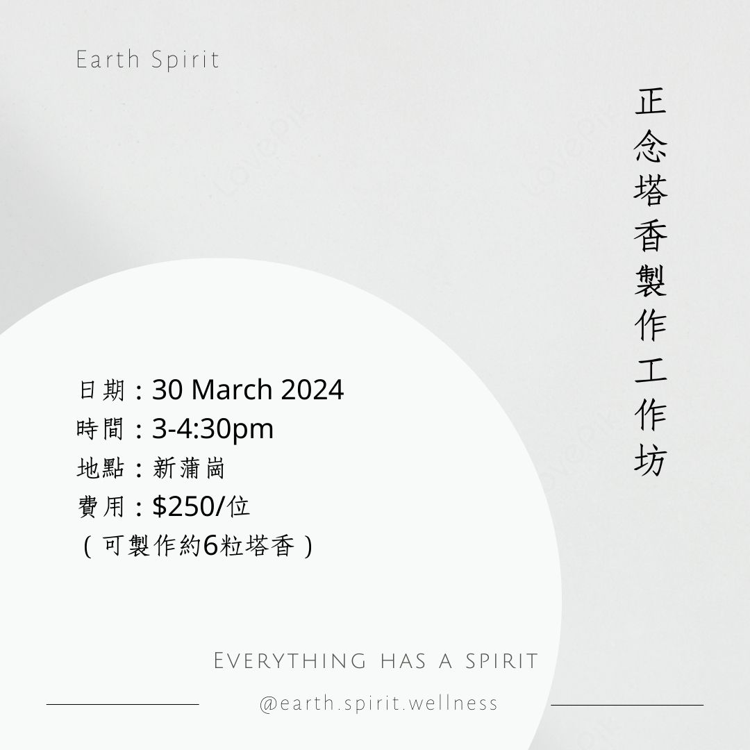 90分鐘的正念手工製香旅程,是給予自己放鬆身心的機會。學習和製作屬於自己的手工塔香,專注研香的時間,暫且放下生活上的煩憂。融入正念元素,協助我們安住在此時此刻,體會與自然的連結,並感受來自大地的滋養。而你所製作的塔香成品,將會協助你培養正念習慣,延續你的喜悅、放鬆和自在。工作坊內容:· 正念放鬆體驗· 學習和製作手工塔香 (可製作約6粒塔香)