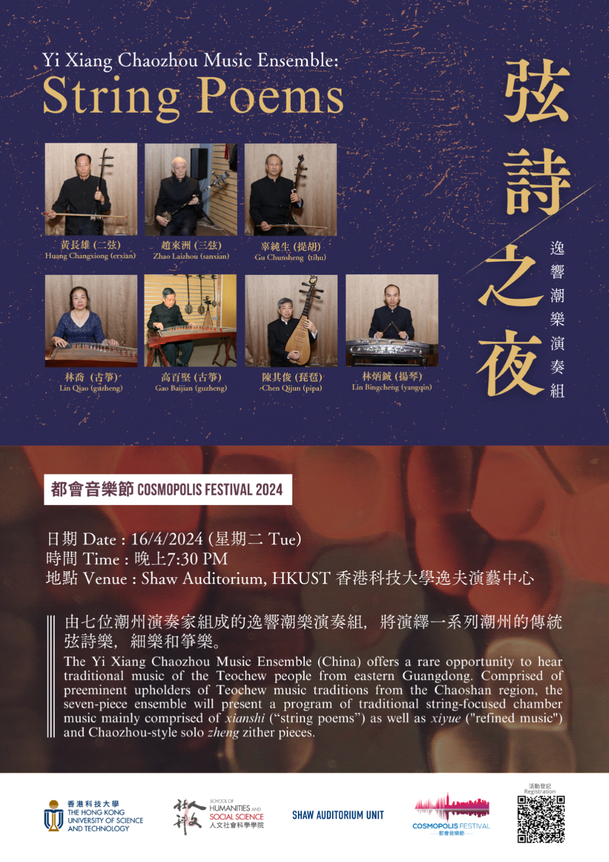 由七名老、中、青潮州音樂演家組成的逸響潮樂演奏組是潮汕地區最優秀的潮州弦詩樂手之一。 他們多有家事傳承淵源,有著較為豐富的演奏實踐, 演奏組旨於能較為原湯原汁地保持潮州音樂的韻味,精心排練了潮州弦詩樂、潮州細樂和潮州箏樂若干有代表性的樂曲,希望能將潮汕地區的優秀傳統音樂文化遺產呈現獻給聽眾。