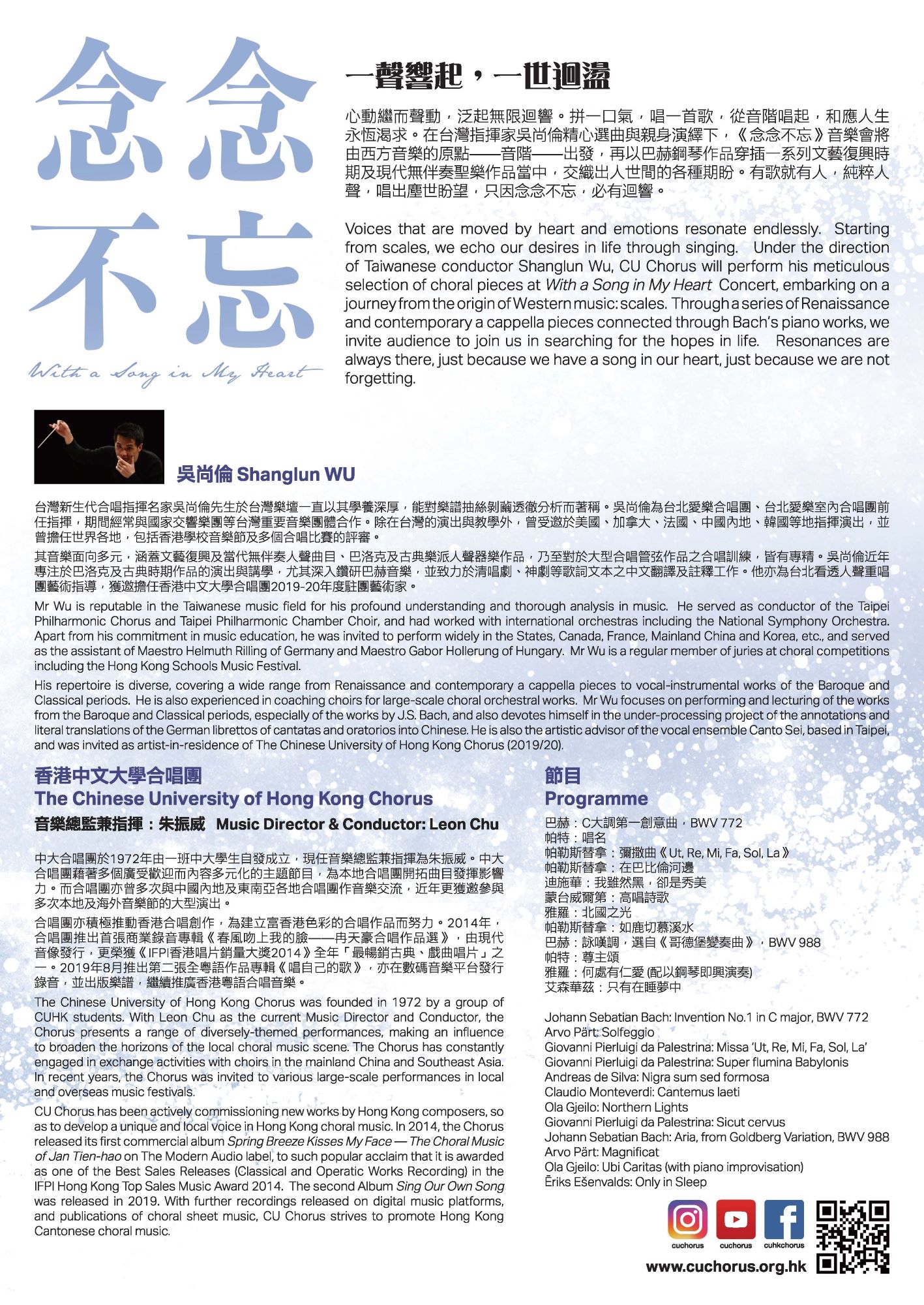 心動繼而聲動,泛起無限迴響。拼一口氣,唱一首歌,從音階唱起,和應人生永恆渴求。在台灣指揮家吳尚倫精心選曲與親身演繹下,《念念不忘》音樂會將由西方音樂的原點——音階——出發,再以巴赫鋼琴作品穿插一系列文藝復興時期及現代無伴奏聖樂作品當中,交織出人世間的各種期盼。有歌就有人,純粹人聲,唱出塵世盼望,只因念念不忘,必有迴響。