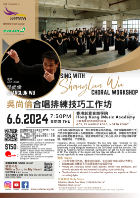 吳尚倫亦將於2024年6月6日主持合唱排練技巧工作坊,分享其合唱排練心得,並親自帶領參加者與中大合唱團一同排練兩首精選曲目。同時購買音樂會及工作坊正價門票,可獲九折優惠。購買6月6日合唱排練技巧工作坊門票請到 https://art-mate.net/doc/74016