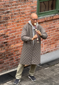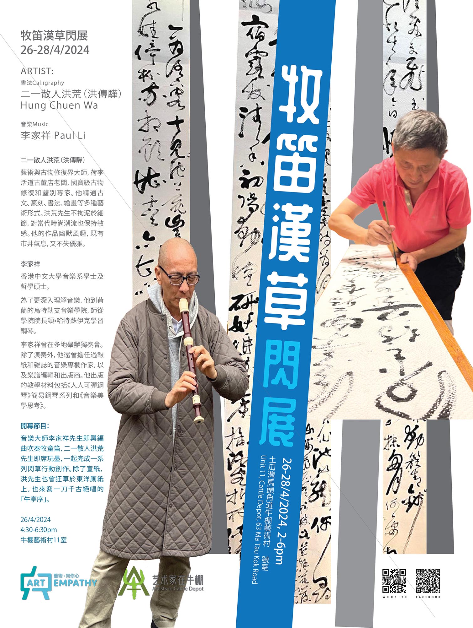 在「牧笛漢草閃展」中,音樂大師李家祥先生將即興编曲吹奏,洪先生即席玩墨,在牛棚的小室之內,一起完成一系列閃草行動創作。除了宣紙,洪先生也會狂草於東洋厠紙上,也來寫一刀千古絕唱的「牛亭序」。二一散人洪荒(洪傳驊),藝術與古物修復界的尊敬大師,荷里活道古董店老闆,國寶級古物修復和鑒別專家。他曾為世界級博物館提供專業意見,亦為香港國際青年藝術家協會藝術總監顧問並精通古文、篆刻、書法、繪畫等多種藝術形式,曾在多地展覽。洪荒先生不拘泥於細節,對當代時尚潮流也保持敏感。他的作品幽默風趣,既有市井氣息,又不失優雅。
