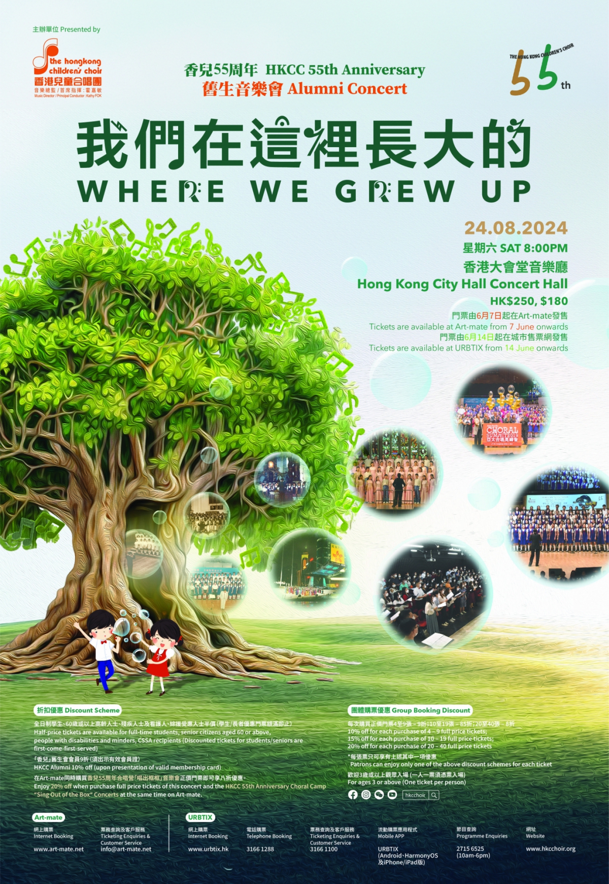 為了慶祝「香兒」成立55周年,合唱團歷屆舊生將再度聚首,呈獻香兒55周年舊生音樂會「我們在這裡長大的」,演繹多首陪伴不同時期舊生成長的合唱歌曲。無論您是否「香兒人」,合唱音樂或許都曾陪伴您成長,誠邀您欣賞這場音樂會,透過音樂回顧您成長路上各個重要時刻。