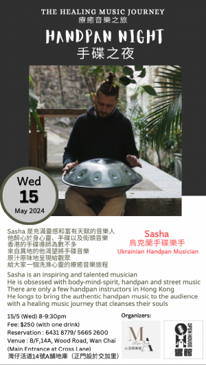 響館將與「心活俱樂部」合辦心靈療癒活動,讓大家暫且放下勞碌的工作枷鎖,來一場徹底的心靈洗滌!15/5(三)晚上,手碟音樂家Sasha將為大家帶來正宗的手碟音樂,大家萬勿錯過,請預早留位!演出者Sasha 是充滿靈感和富有天賦的音樂人他醉心於身心靈、手碟以及街頭音樂香港的手碟導師為數不多來自異地的他渴望將手碟音樂原汁原味地呈現給觀眾給大家一個洗滌心靈的療癒音樂旅程