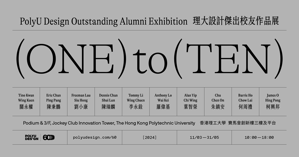 為慶祝香港理工大學設計學院六十周年及其眾多校友的卓越成就,學院將於今年3月11日至5月31日於理大校園賽馬會創新樓平台特別舉辦《One To Ten》理大設計傑出校友作品展,引領大眾探索設計知識傳遞的多樣性和變化,表揚十位校友在多個領域的成就和貢獻。此外,展覽會以十種形態和傳遞方式全新註釋十位傑出校友的作品,讓觀眾親身體驗校友在設計領域中的創意展示。