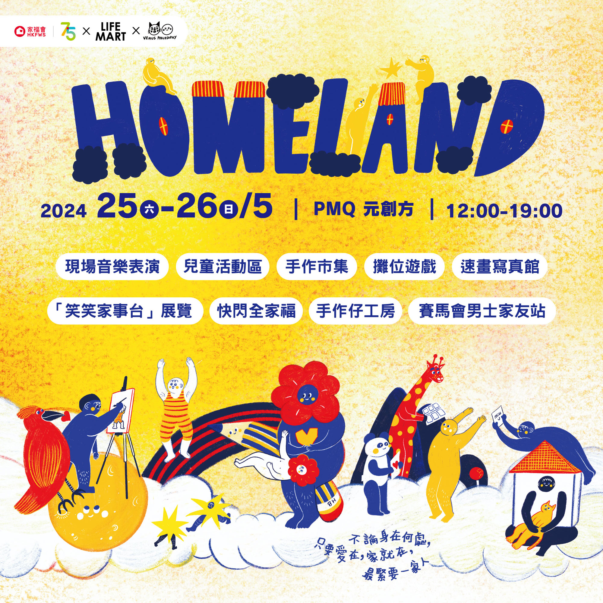 家福會的「最緊要一家人」企劃團隊今年再次聯同 LIFE MART 籌辦「Homeland」家庭市集,適逢家福會成立75周年,以「愛在‧家在」作為主題,團隊邀請到插畫師 Venus Philosophy 透過三原色,讓大家沉浸在宛如虛幻卻有無限可能的空間,也就是「愛在‧家在」的演繹—— 「愛,不設地域限制;愛,無邊距、無界限」,希望給予公眾突破邊界的勇氣,繼續尋找家庭幸福,感受滿滿的愛。