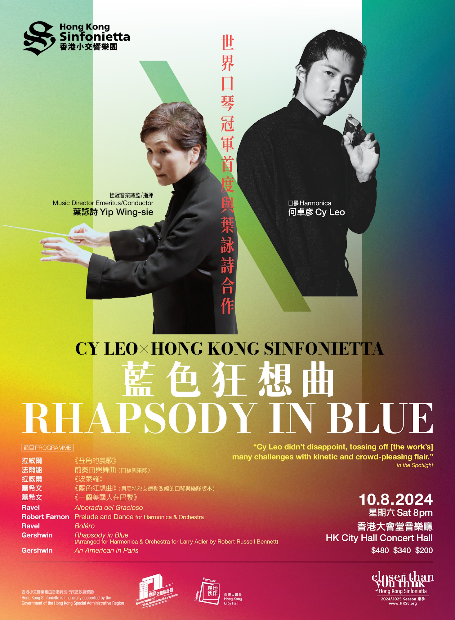 極具魅力的香港超技口琴演奏家Cy Leo是2009及2013年世界口琴節兩屆冠軍,他早於19歲時已奪得17個國際獎項,其勇於創新的音樂風格亦令他風靡流行、爵士、獨立音樂以至古典音樂界,是本地少有揚威國際的音樂驕子。Cy Leo 將首度夥拍香港小交響樂團桂冠音樂總監葉詠詩及樂團,演奏蓋希文經典的《藍色狂想曲》,並且是特別為口琴大師艾德勒而改編的口琴與樂隊版本,而且他還會演奏加拿大作曲家法爾能的「前奏曲與舞曲」,展現口琴與管弦樂的非凡魔力!