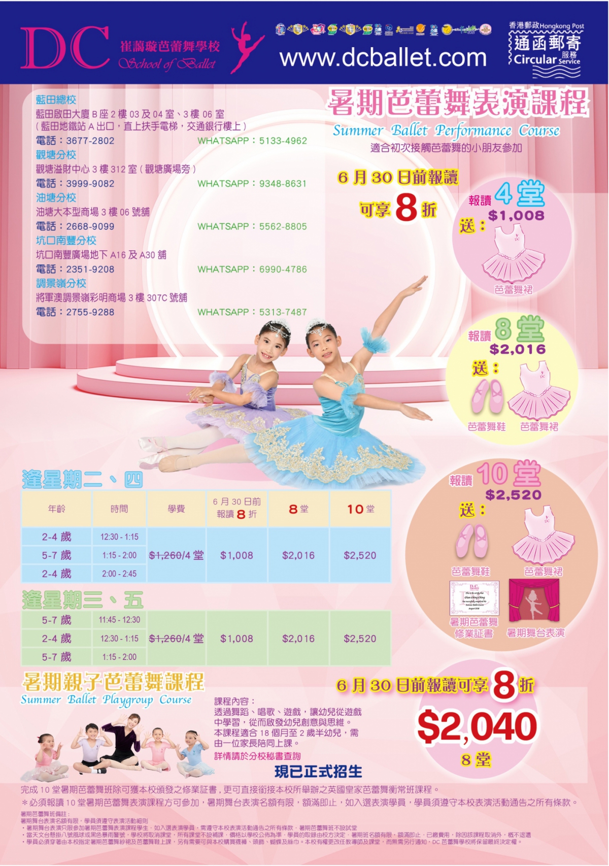 本校將於7月至8月暑假期間推出暑期芭蕾舞班課程,主要讓從未接觸過芭蕾舞的小朋友可以透過不同故事氣氛體驗芭蕾舞。本課程能夠讓小朋友掌握芭蕾舞的基本知識、教授基本拉筯活動以提升柔軟度、簡單肌肉及平衡訓練、多種跳躍練習等等、可讓學員提升專注力,在輕鬆的音樂旋律下,讓幼兒從遊戲中學習,啟發思維。另外,完成10堂暑期芭蕾舞班,除可獲本校頒發之修業證書外,亦有機會參加於荃灣大會堂舉行的「DC舞出自信」暑期結業禮,更可直接銜接本校所舉辦之英國皇家芭蕾舞恆常課程。