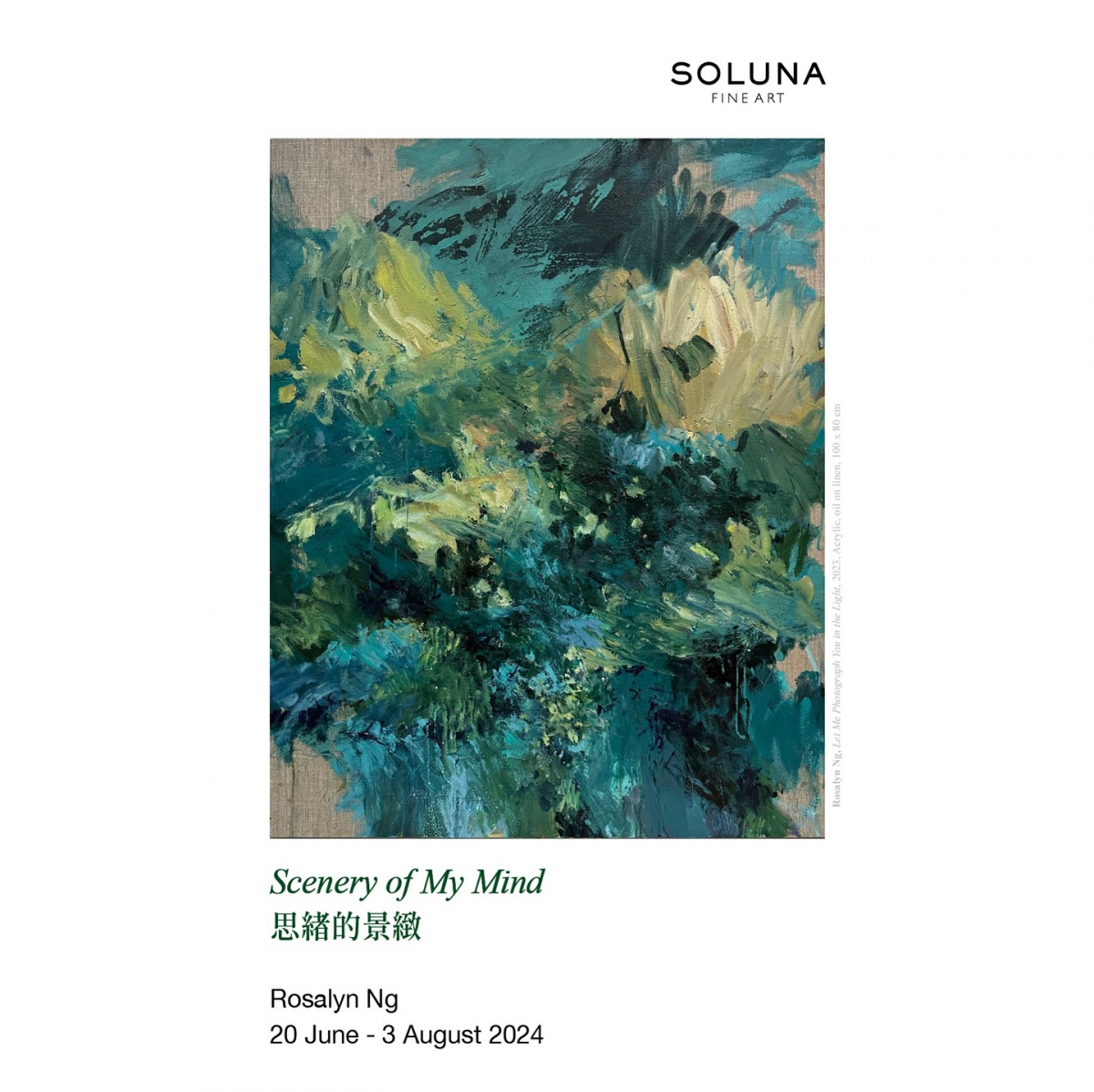 Soluna Fine Art誠意呈獻香港新生代藝術家吳芮慇 @ros___n 與畫廊合辦的首個個⼈展覽「思緒的景緻」。於香港土生土長,吳氏的創作一直突破煩囂都市的局限,以繪畫取代語言探索世間萬物,在畫布上重構本人的思想世界。是次展覽將會展出一系列吳氏的最新作品,整體概念圍繞探索自然和人為、理性與感性等乍看矛盾但實質共存的概念,以吳氏獨到的美學帶領觀眾感受對立之中的和諧。誠邀觀眾踏進吳氏內心深處的秘密庭園,感受吳氏的創作中所蘊含的豐富情緒,讓彼此的靈魂赤裸交匯。
