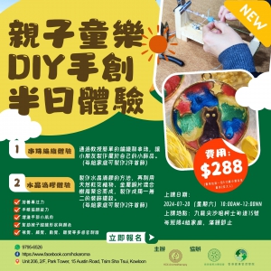課程內容:1. 水晶滴膠工作坊:教授製作水晶滴膠的方法,再利用天然乾花植物、金屬銅片混合樹脂聚合而成,製作成獨一無二的裝飾擺設。2. 串珠編織:通過教授簡單的編織和串珠,讓小朋友製作屬於自己的小飾品。(每組家庭可製作2件首飾)- 增進手部小肌肉- 手眼協調能力- 培養專注力- 幫助孩子認識形狀與顏色- 視覺、觸覺、動覺、聽覺等多感官刺激