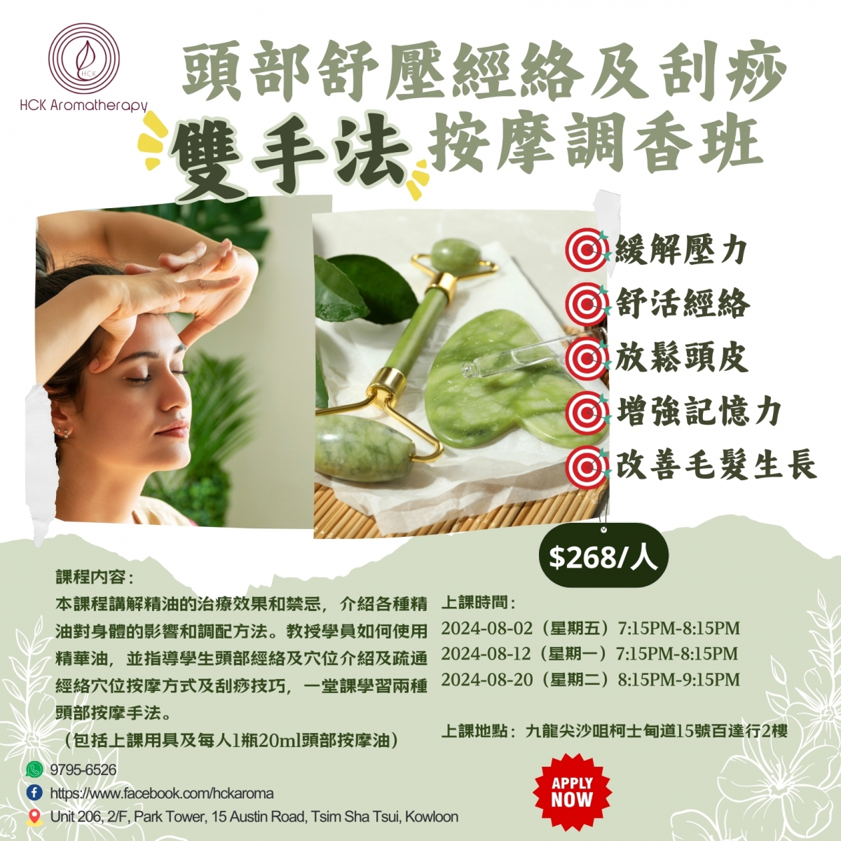 頭部按摩能夠預防腦部疾病的發生、舒緩疲憊的身心靈,也對頭皮護理有很好的效果。本課程講解精油的治療效果和禁忌,介紹各種精油對身體的影響和調配方法。教授學員如何使用精華油,並指導學生頭部經絡及穴位介紹及疏通經絡穴位按摩方式及刮痧技巧,一堂課學習兩種頭部按摩手法。(包括上課用具及每人1瓶20ml頭部按摩油)