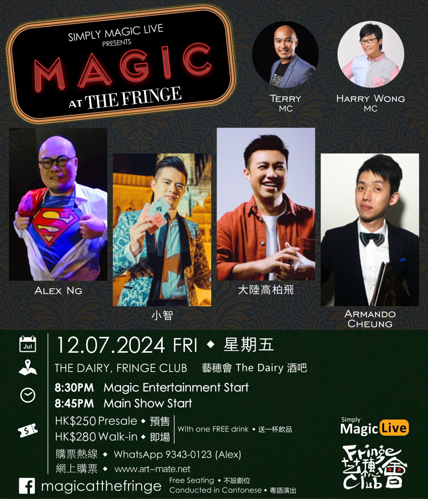 一班香港魔術師,將會齊集於中環藝穗會奶庫 The Dairy,獻上他們最熱愛和擅長的舞台和近景魔術!透過出神入化的技巧、秘密和心理學,加上強勁的顏值和魅力,全力轟擊每一位現場觀眾的五感及心靈深處,並為大家帶來無限的可能性!最天馬行空的魔術即將發生於眼前,並在你的腦海中綻放!