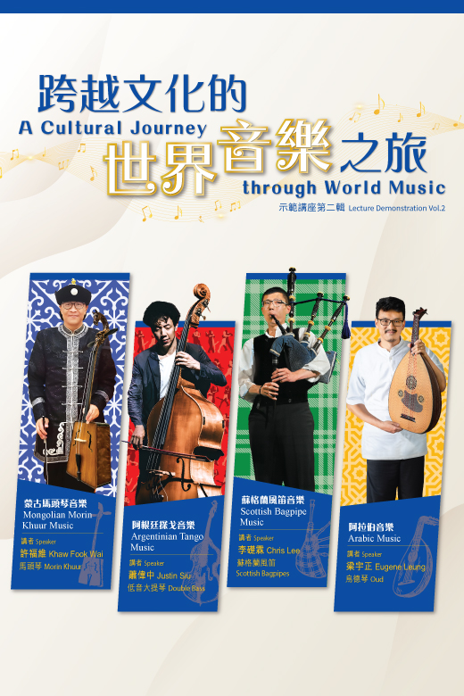 「跨越文化的世界音樂之旅」示範講座今年再次帶來多位扎根本地、同時鑽研異地傳統音樂的音樂家,將在一連四場講座為大家作世界音樂的嚮導。從蒙古到阿根廷,從蘇格蘭到亞拉伯地區,透過介紹歷史文化、示範演奏樂器及分享親身學習的經驗,帶領觀眾跨越文化的界限。