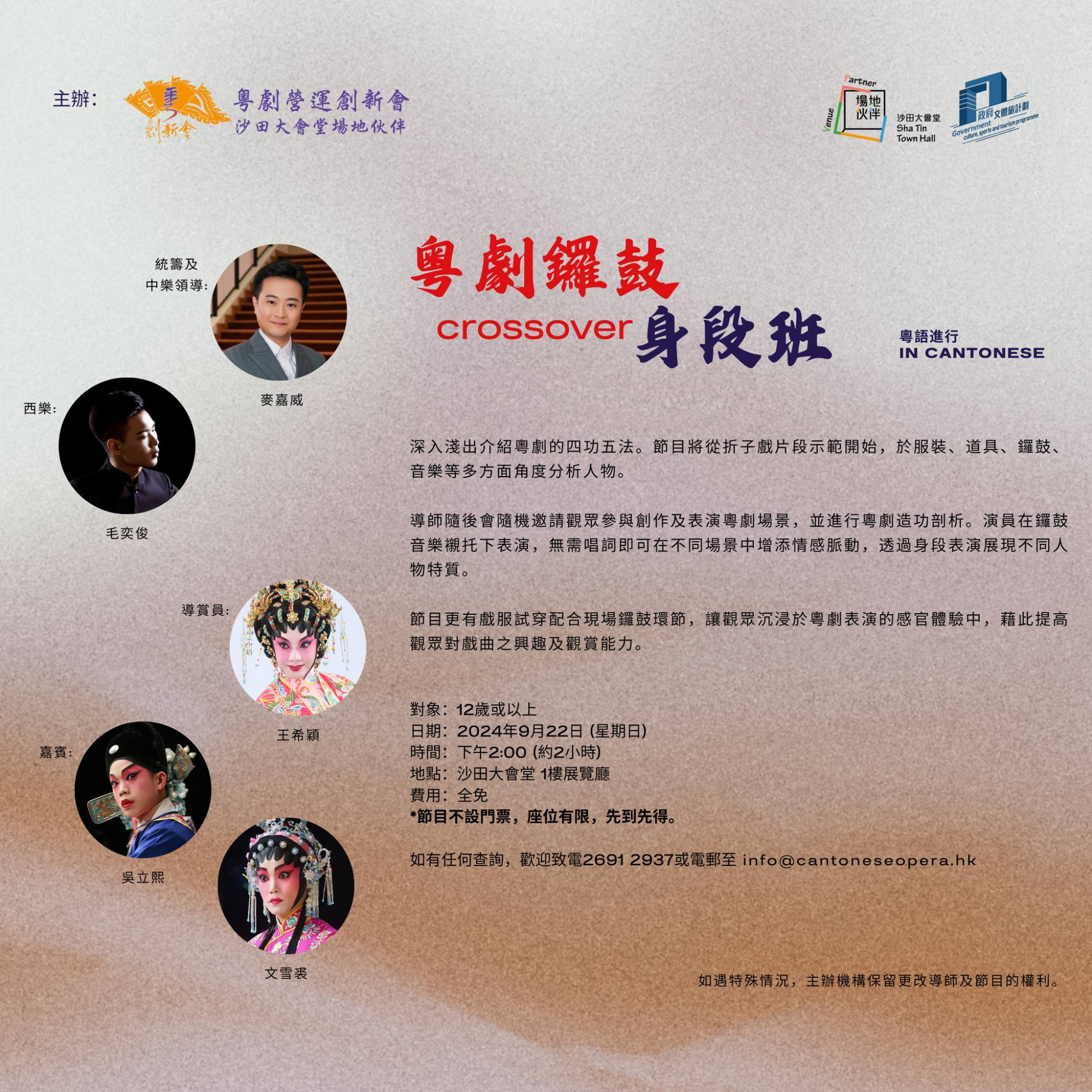 深入淺出介紹粤劇的四功五法。節目將從折子戲片段示範開始,於服装、道具、鑼鼓、音樂等多方面角度分析人物。導師隨後會隨機邀請觀眾參與創作及表演粵劇場景,並進行粤劇造功剖析。演員在鑼鼓音樂襯托下表演,無需唱詞即可在不同場景中增添情感脈動,透過身段表演展現不同人物特質。節目更有戲服試穿配合現場鑼鼓環節,讓觀眾沉浸於粵劇表演的感官體驗中,藉此提高觀眾對戲曲之興趣及觀賞能力。