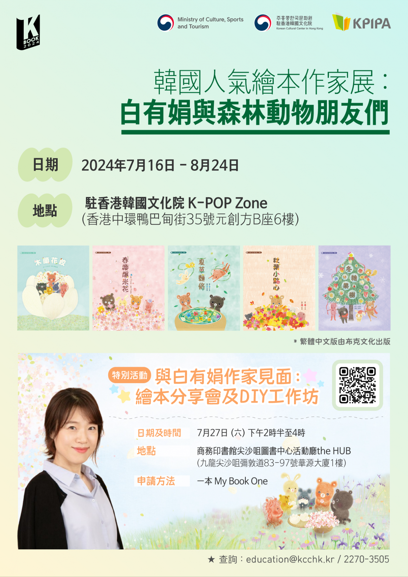 駐香港韓國文化院將舉辦韓國人氣繪本作家白有娟的個人展覽。展覽將展出白有娟作家的繪本、繪本相關版畫作品以及繪本角色紀念品,亦能與森林動物點心饗宴系列中出現的動物朋友們見面!