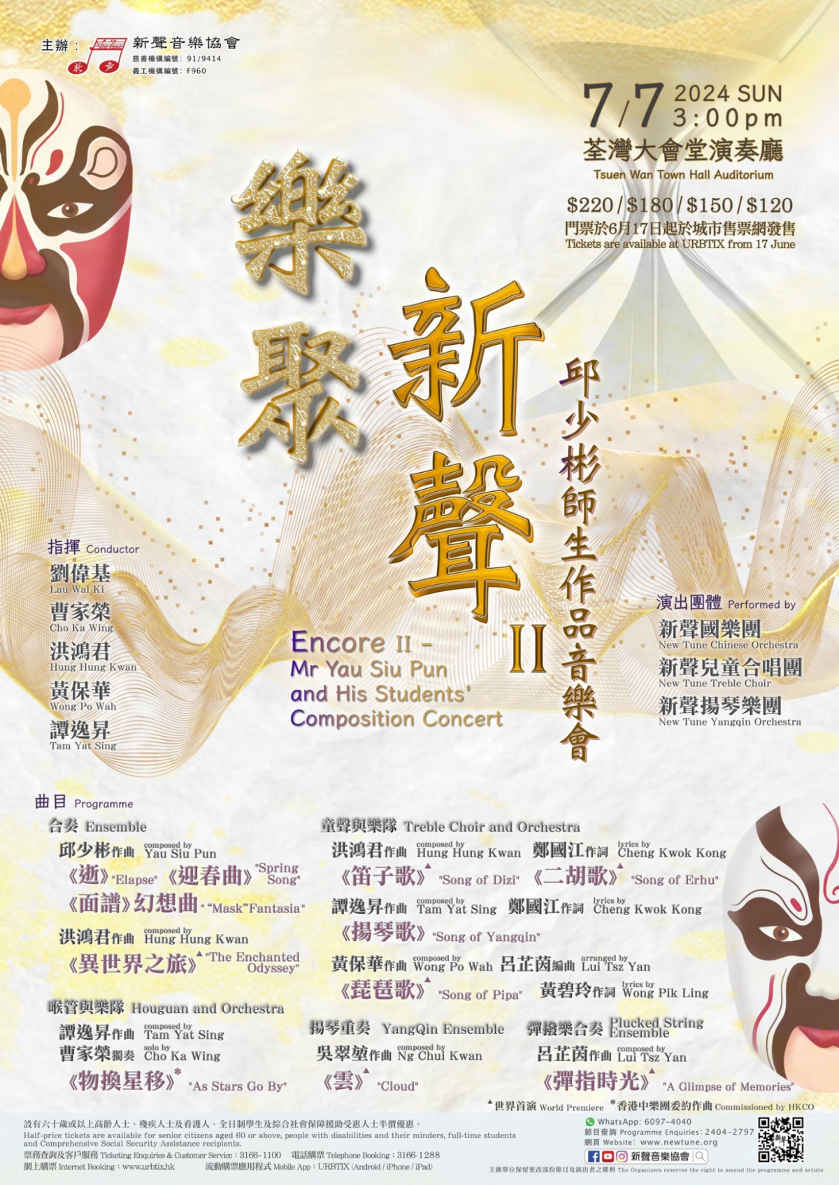 新聲音樂協會主辦《樂聚新聲II》邱少彬師生作品音樂會,由新聲國樂團、新聲兒童合唱團及新聲揚琴樂團演出由已故本地音樂家邱少彬和他的門生創作的多首樂曲,包括邱少彬作曲《逝》、《迎春曲》、《面譜》幻想曲;洪鴻君作曲《異世界之旅》(世界首演);譚逸昇作曲、曹家榮獨奏喉管與樂隊《物換星移》等作品。這場音樂會將為您展現香港本地作曲家的音樂世界,千祈唔好錯過!