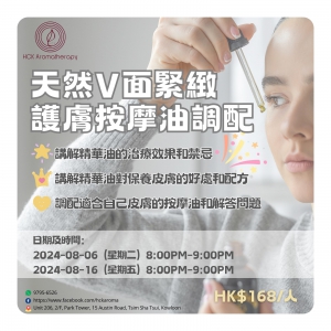 本課程講解精華油對保養皮膚的好處和配方,教授學院製作無添加化學物質的天然面部護理油,用純天然的植物精華油去平衡和調理我們的皮膚,達致緊緻提升、祛水腫、祛紋、抗衰老、護膚多元功效。(包括上課材料及1瓶10ml天然V面護膚按摩油)