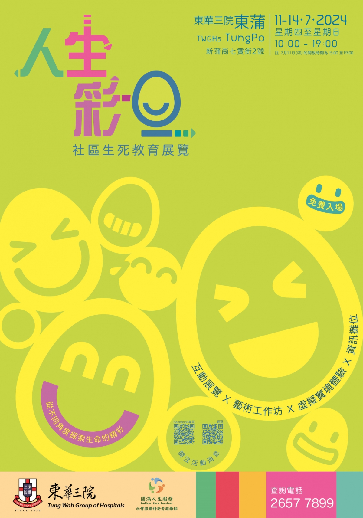 人生累積不同的彩蛋,透過珍惜和感受這些人生彩蛋,可以積極面對生命中的困境。即使迷失時,同樣可以活得自在,珍惜當下。東華三院「圓滿人生服務」於2024年7月11至14日假東華三院東蒲舉辦 「人生彩蛋社區生死教育展覽」,透過連串簡單、有趣又富資訊的互動展覽裝置,以輕鬆幽默手法啟發老、中、青三代的社區人士重新審視生命的價值和意義,了解自己與身邊人的關係,從而坦然地接受生命中的起伏,以「笑」迎接人生的不同階段。