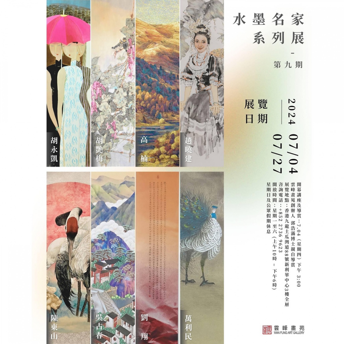 即將在2024年7月4日下午三時舉行的第九期水墨畫名家八人展將有胡永凱、劉翔、陳東山、高楠、吳占春、胡艷梅、 萬利民、趙曉健八位。其中胡永凱早在九十年代就享譽歐美東南亞,後進軍神州大陸,憑藉高超的藝術技巧和鮮明的藝術風格贏得中國藝術界和收藏界高度的認可,並成中國當代畫壇重要的一員;劉翔本為中國著名書法家,現任中國書畫家研究會副會長兼秘書長,近年他以現代水墨結合書法創出自己的獨特風格,這次在香港亮相將帶來耳目一新的感覺;陳東山本為香港一位實力派畫家,擅長花鳥、動物畫。近年他的花鳥畫以貼近人們生活見稱,充滿生活情趣且獨樹一幟,獲得廣大藝術愛好者和藏家好評;高楠出身於文化世家,年紀輕輕就顯示了卓越藝術才華。後在香港、 美國等地定居並從事藝術創作,獲奬無數,其創作的重彩山水風格強烈、難度超高受到廣泛的好評;吳占春為北京著名畫家,他的作品以讓人過目不忘著稱,傳統加現代,為中國山水畫創造了新的品種,在中國繪畫史亦將留下自己鮮明的印記;胡艷梅為全球水墨畫大展冒出的新秀, 她的水墨靈動、構圖新頴的作品吸引萬千觀眾,為花鳥畫領域被廣泛看好的女畫家;萬利民擅長工筆花鳥,尤擅長孔雀題材,曾經出版多本孔雀專題畫集,獲得廣泛好評;趙曉健為中國畫壇冒起的明日之星,年富力強。他為藝術大師趙建成的得意弟子,功力扎實,人物造型能力強,曾參與趙建成"開國大典"等多幅大型歷史名作的創作工作,得益良多。現在首次亮相香港,前景無量。以上八位優秀畫家各顯才華,他們的作品將帶給香港觀眾美好的藝術大餐,歡迎光臨分享。