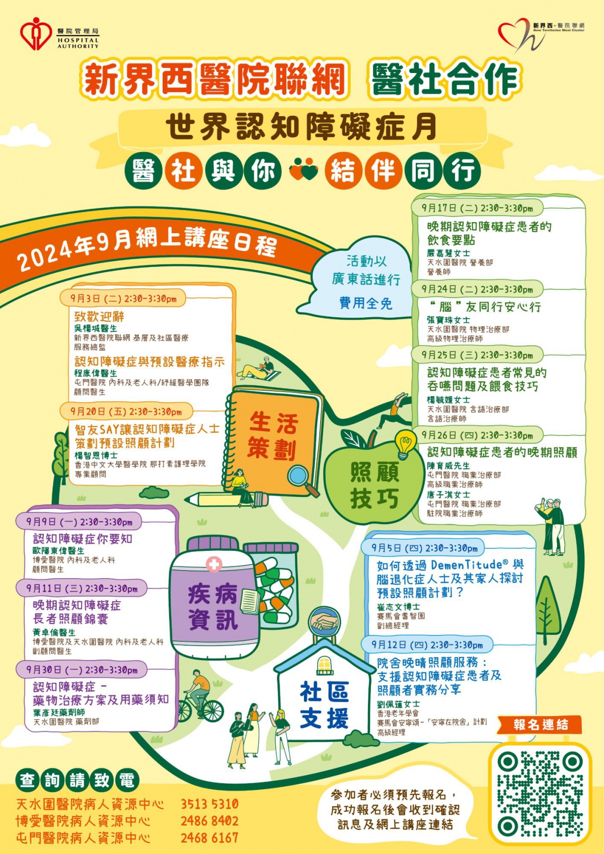 新界西醫院聯網致力推動醫社合作,將於二零二四年九月期間與社區夥伴攜手協作,舉辦一系列有關認知障礙症的線上賦能講座,旨在提升各界人士對此病的認識及關注,讓患者及照顧者在社區得到適切的社區照顧及支援,並響應每年九月的「世界認知障礙症月」。