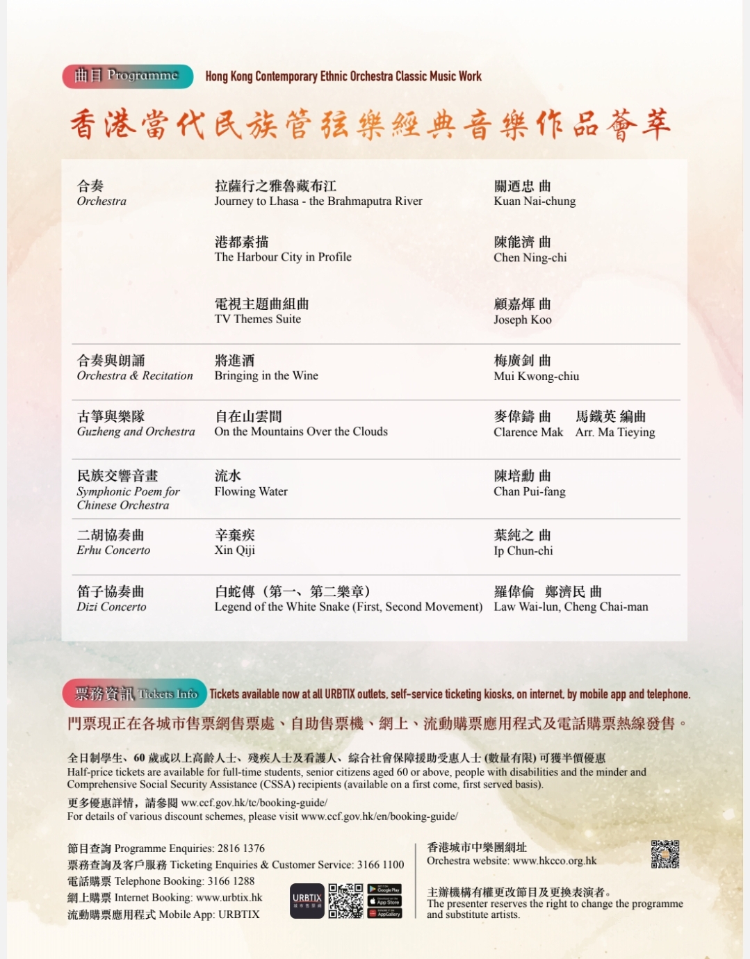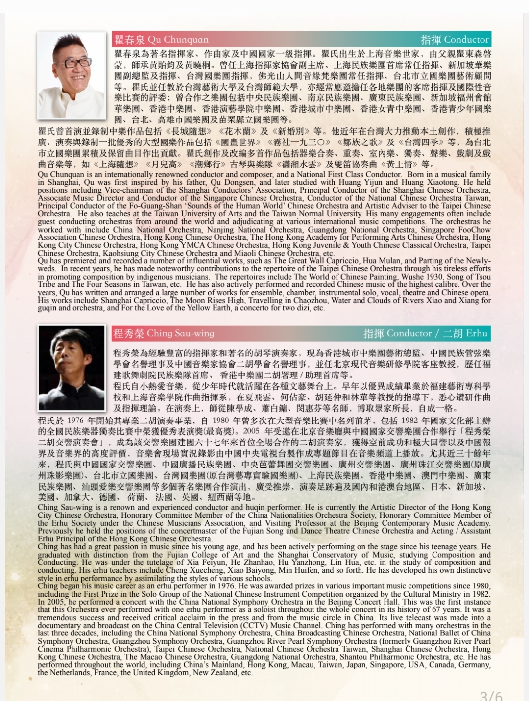 是次於中華文化節的音樂會乃是國家藝術基金資助項目的升級版,演奏多位香港傑出作曲家的經典中樂作品,並且特邀多位大師級人馬聯袂主演,其中有著名指揮家、演奏家瞿春泉、程秀榮、杜如松及吳曉紅等名家,還有本港著名戲劇演員杜施聰先生出演;我們將通過這次音樂會講述更多精彩的中國故事、香港故事。
