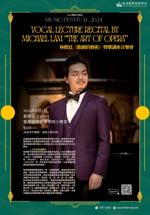 專業歌劇聲樂家林俊廷將在講座音樂會帶你探索歌劇的奧妙世界,講者分享他在歌劇領域上的豐富知識和經驗,精彩的即場演繹和解說,掲示歌劇在現代舞台上之歌唱(Singing)及演戲(Acting)的藝術。
