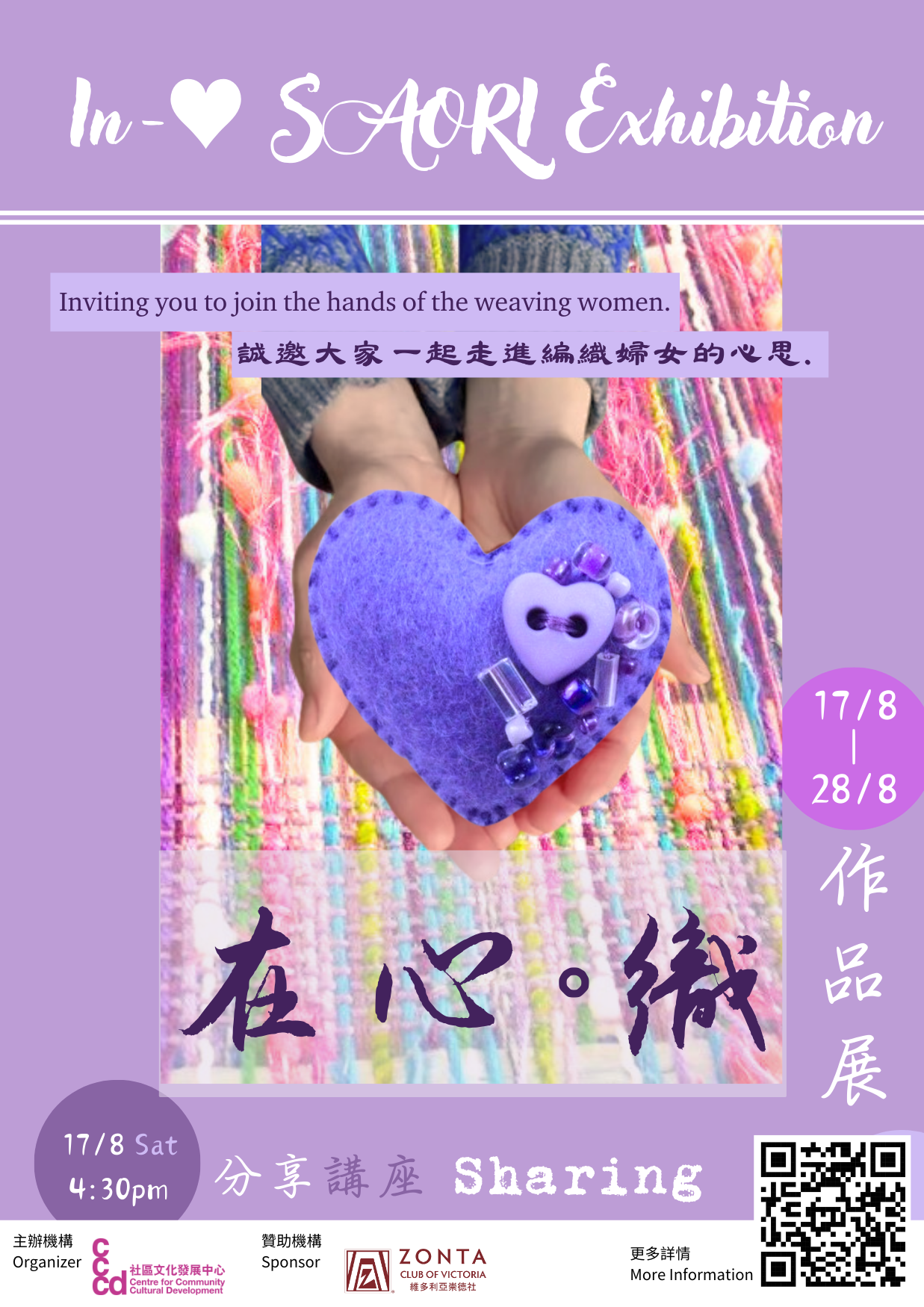 誠邀大家走進一羣編織婦女的心思,欣賞她們早前在編織藝術治療小組所製成的SAORI。在展覽中與她們𢹂手將色彩、情感與經驗編進生活,一起欣賞生命的美。分享講座日期: 17/8/24時間:16:30 - 17:30講者: 彭秀芝 Maria Pang(註冊藝術治療師Registered Art Therapist)語言: 廣東話