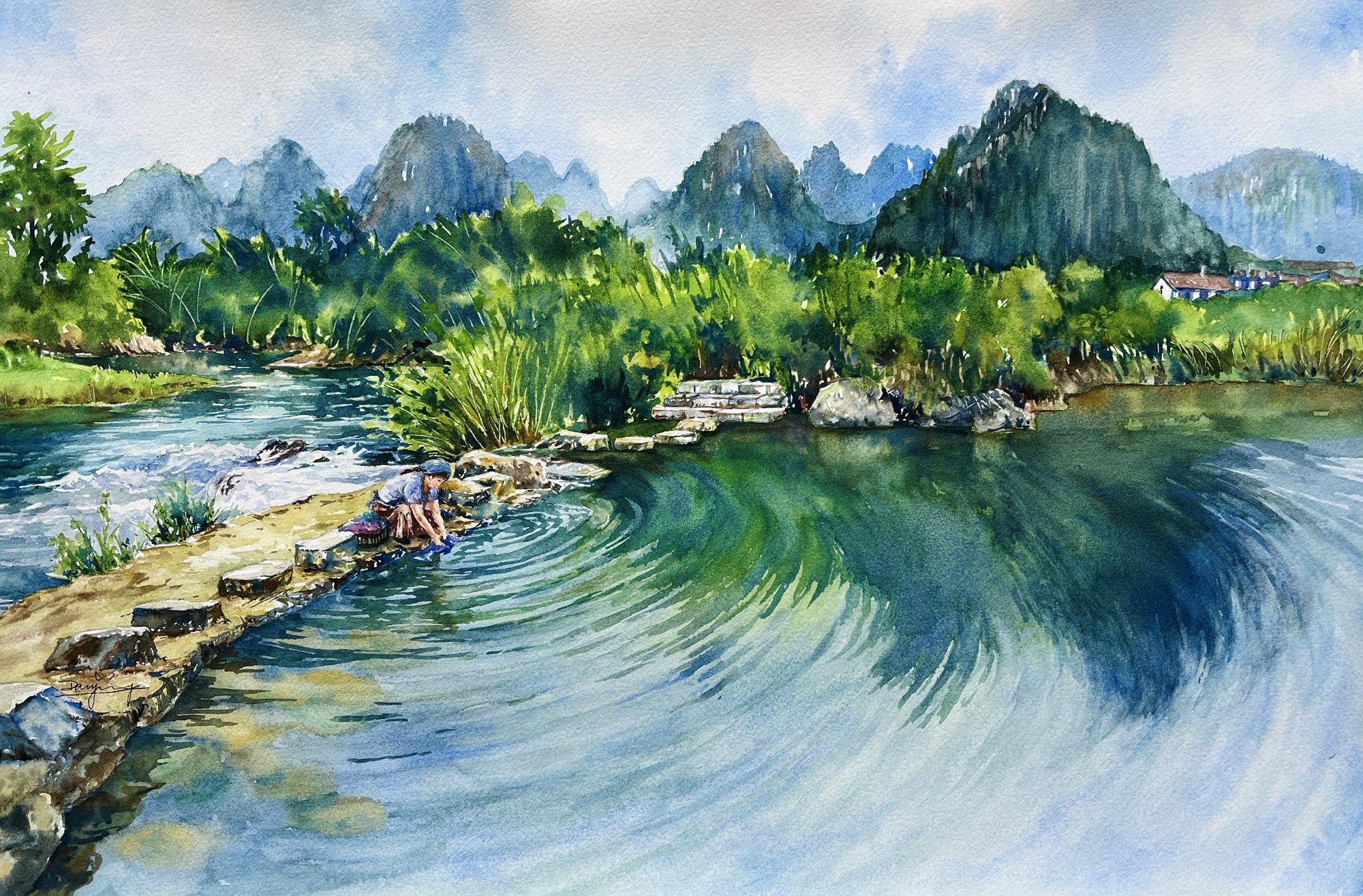 戴影擁有金融背景,卻對水彩藝術念念不忘。運用西方水彩技法,捕捉東方自然景觀的寫實與詩意,創造東西方藝術融合的獨特風格。她喜在作品內,寫出直、橫和彎向的河景、岸景和路景,希望把觀者的視覺不局限於畫面,而能想像到景物在畫面以外,可延伸的空間。