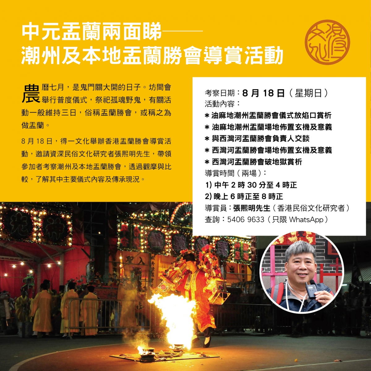 8月18日,得一文化舉辦香港盂蘭勝會導賞活動,邀請香港資深民俗文化研究者張熙明先生,帶領參加者考察潮州及本地族羣舉辦的盂蘭勝會,透過觀摩與比較,了解其中的主要儀式內容及傳承現況。