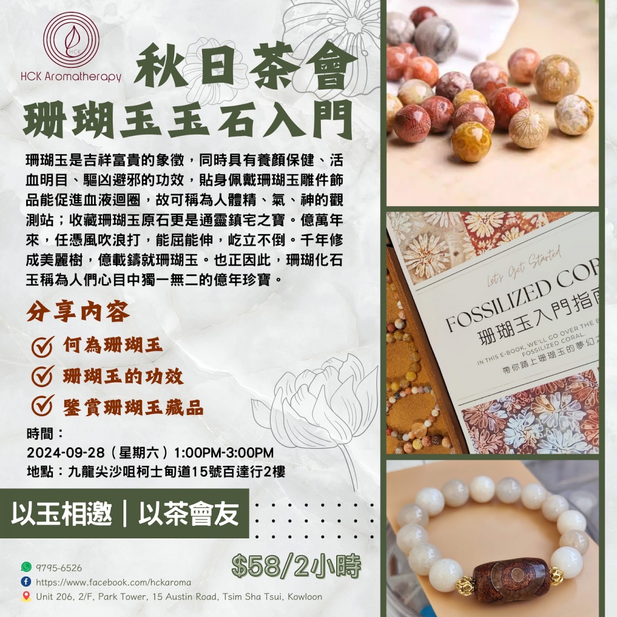 以玉相邀 | 以茶會友,兩小時一邊品茶,一邊認識珊瑚玉的萬年文化。1)何為珊瑚玉2)珊瑚玉的功效3)鑒賞珊瑚玉藏品珊瑚玉是吉祥富貴的象徵,同時具有養顏保健、活血明目、驅凶避邪的功效,貼身佩戴珊瑚玉雕件飾品能促進血液迴圈,故可稱為人體精、氣、神的觀測站;收藏珊瑚玉原石更是通靈鎮宅之寶。億萬年來,任憑風吹浪打,能屈能伸,屹立不倒。千年修成美麗樹,億載鑄就珊瑚玉。也正因此,珊瑚化石玉稱為人們心目中獨一無二的億年珍寶。