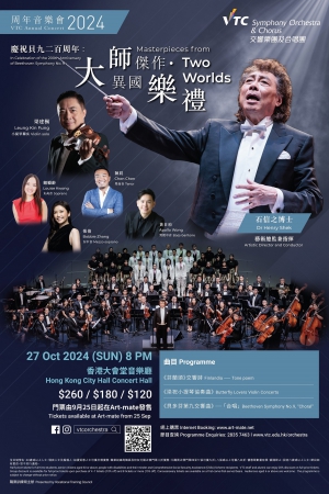 從講述梁山伯與祝英台淒美中國民間故事的《梁祝小提琴協奏曲》;抒展凱旋氣魄的《芬蘭頌》;以至誕生200周年、融合聲樂與器樂的貝多芬第九交響曲《合唱》——就是大家耳熟能詳的《歡樂頌》——這場音樂會將跨越地域界限,向觀眾呈現來自東西方音樂大師超越時空的偉大傑作,一同歌頌「希望」、「歡樂」及「和諧」!
