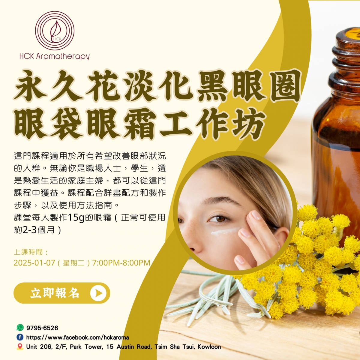 你是否經常熬夜工作,學習,或者休閑娛樂,而導致眼部疲勞,黑眼圈、眼袋嚴重?本工作坊將教導如何利用天然的植物精油及永久花精油和有效的護膚技術,製作適合你自己的眼霜,從而改善您的黑眼圈和眼袋,讓雙眼煥發青春光彩。這門課程適用於所有希望改善眼部狀況的人群。無論你是職場人士,學生,還是熱愛生活的家庭主婦,都可以從這門課程中獲益。課程配合詳盡配方和製作步驟,以及使用方法指南。課堂每人製作15g的眼霜(正常可使用約2-3個月)
