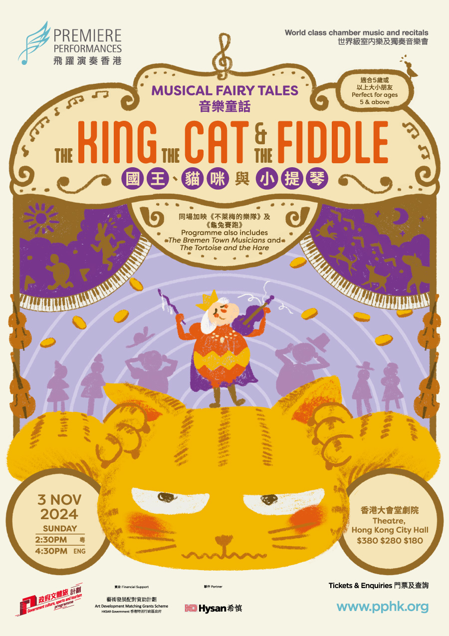 飛躍演奏香港曾於2023及2024年推出音樂童話系列,廣受歡迎,今年11月再度回歸,帶來由知名小提琴家梅紐因及霍普共同創作,艾道夫作曲,充滿奇幻的故事 ——《國王、貓咪與小提琴》。音樂會亦呈獻兩個經典童話作品,包括格林兄弟《不萊梅的樂隊》及伊索寓言《龜兔賽跑》。適合五歲或以上大小朋友。