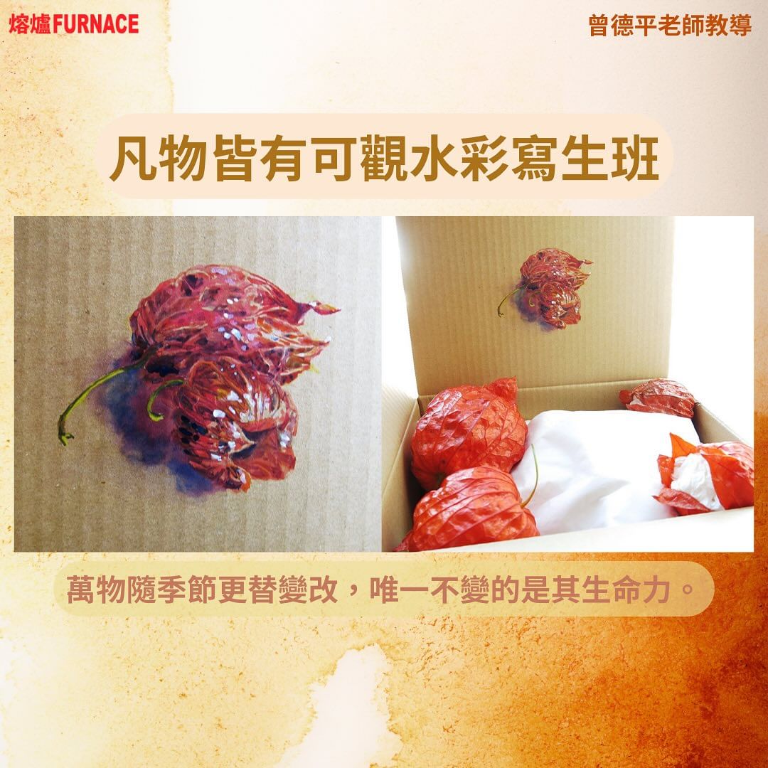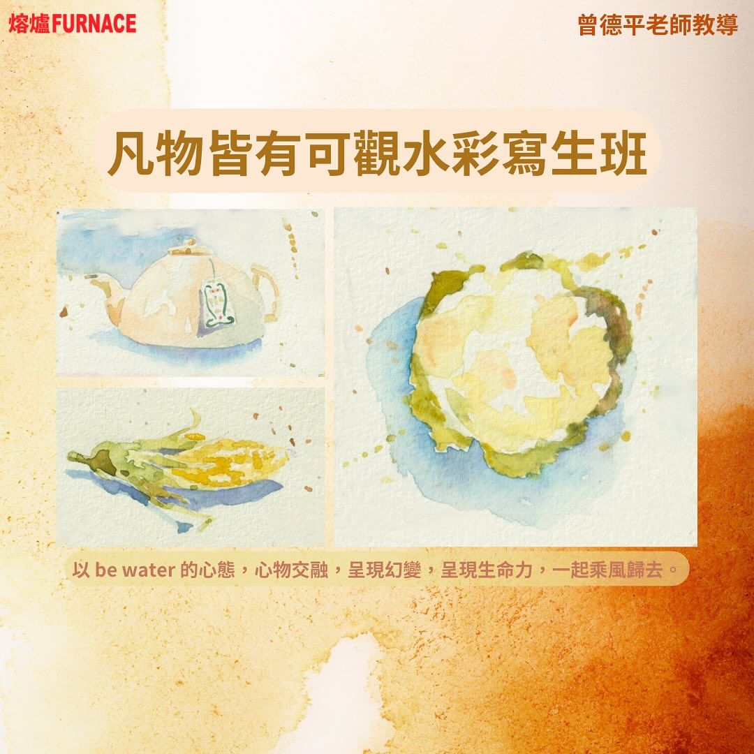凡物皆有可觀。可觀,皆有可畫。在九樓不勝寒的熔爐靜觀萬物,圍爐寫生,迎接秋天。萬物隨季節更替變改,唯一不變的是其生命力。水添彩,彩加水,可軟、可硬,更可軟硬兼容。以 be water 的心態,心物交融,呈現幻變,呈現生命力,一起乘風歸去。教學內容:* 觀察靜物方法* 介紹水彩寫生技法* 建立基本寫生技巧* 作品賞析