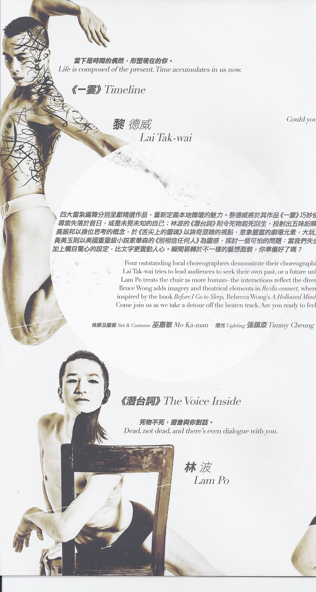 總在下一個轉彎 遇見你城市匆忙變奏,牽動生活的每個面向。舞者遊歷四方,以精銳視角審視無常與尋常。四位各有千秋的本地舞者──黎德威、林波、黃振邦及黃美玉,俯拾細瑣的線索與感知,分別呈獻幾段別出心裁的精緻短篇,訴說他們各自細意咀嚼的世界。游弋幻想與懸念,瞬間易轉於不一樣的藝想面貌,或許你可在某個彎角,看見自己……
