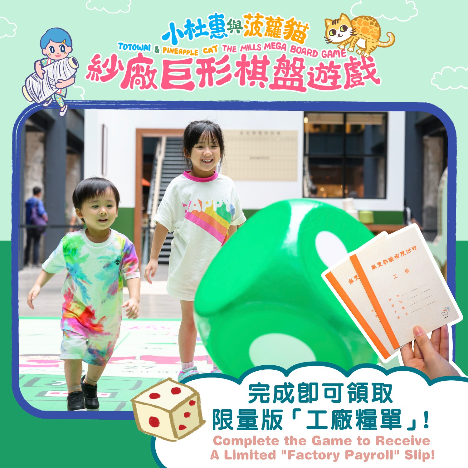 今個暑假,南豐紗廠將以舊日紗廠情懷迎接各位大小老友記!我們為紗廠童樂節精心設計了原創桌上遊戲,更將南豐紗廠地下紗廠坊打造成期間限定巨形棋盤,讓大人小朋友寓學習於遊戲,發掘昔日工友們的工作、生活鮮為人知的一面,了解香港紡織工業的輝煌歲月,所有NF Touch會員均可免費參加。完成棋盤遊戲及參觀CHAT六廠,更可獲得限量版的「工廠糧單」作紀念品*,化身紗廠「小工友」!