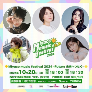 由MIACO Plus主辦,動畫歌曲音樂節「MIYACO MUSIC FESTIVAL 2024」將於10月20日(星期日)假 西九文化區自由空間大盒舉行。 來到第二屆的音樂節,今年我們很榮幸邀請到以下5位動畫歌手出演「MIYACO MUSIC FESTIVAL 2024」: