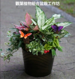 選取幾種不同品種的觀葉植物,自由拼合成 多姿多彩的組合盆栽 加上以絲襪花製作的蝴蝶, 蜜蜂或蜻蜓裝飾,更顯美觀艷麗。
