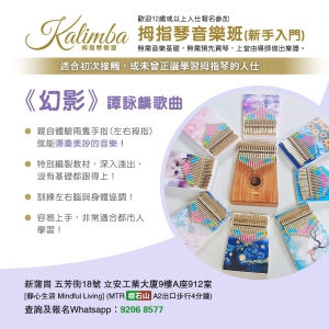 工作坊簡短介紹: .無需音樂基礎!無需預先買琴,上堂由導師借出樂器! .適合初次接觸,或未曾正識學習拇指琴的人仕! .親自體驗兩隻手指(左右拇指)就能彈奏美妙的音樂! .特別編製教材,深入淺出,沒有基礎都跟得上! .訓練左右腦與身體協調! .容易上手,非常適合都市人學習!